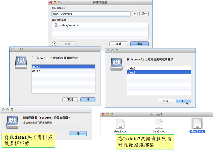 透過Kerberos協定登入Active Directory網域成功後,您就可以直接存取擁有權限的網域資源,例如下圖為存取網域內檔案伺服器之二個共用資料夾的畫面,第一個共用資料夾,網域使用者並無任何存取權限,故被直接拒絕,而第二個共用資料夾,使用者具有讀取權限,因此可以直接檢視其內容,存取時無需再度提示與輸入密碼。